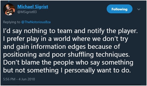 I think this is where people get tripped up and where a lot of confusion came in. Based on my social media it's pretty clear most players believe that there is nothing wrong with looking at the opponents while shuffling in an effort to see if they will mess up and shuffle in a revealing way. The more I've thought about this line the less I am happy with it and the more I feel like it's trying to gain an unfair advantage. This is either passively attempting to gain an advantage or actively trying to do so.