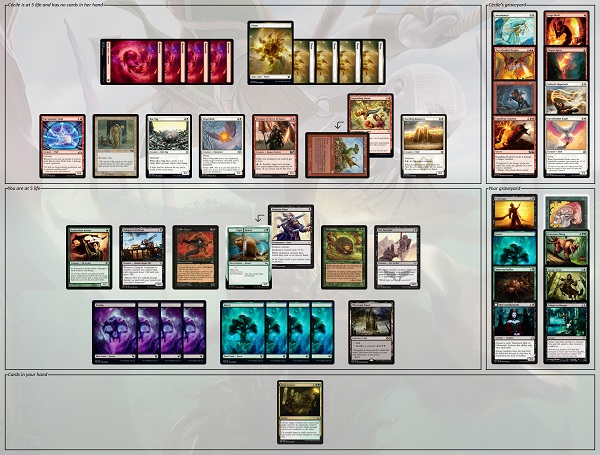 Cécile is at 5 life and has no cards in her hand. She has the following cards in play: