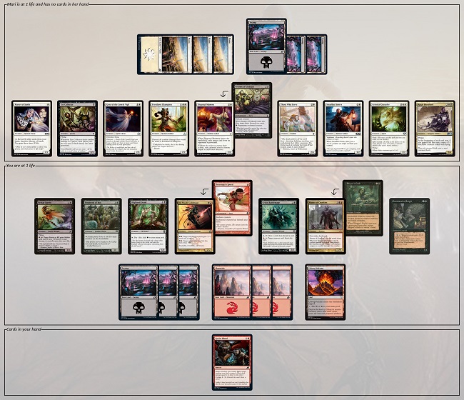 Mari is at 1 life and has no cards in her hand. She has the following cards in play: