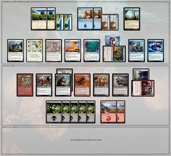 Cristina is at 5 life and has no cards in her hand. She has the following cards in play: