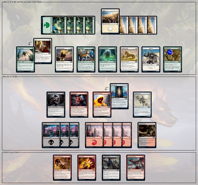 You flip through the four cards in your hand once more, making sure that you're not missing out on any details. If Elliot's not making things up and really has some lifegain in his deck, you probably want to keep him from playing it. And the best way to do so, you muse, is to make sure that he doesn't reach it in the first place.
