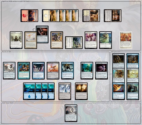You have not yet played a land this turn. You still have a substantial number of cards remaining in your library, but you know neither the identities nor the order of those cards.