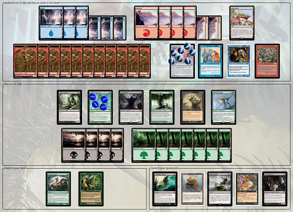 Jackson is at 15 life, and has no cards in his hand. He has the following cards in play:
