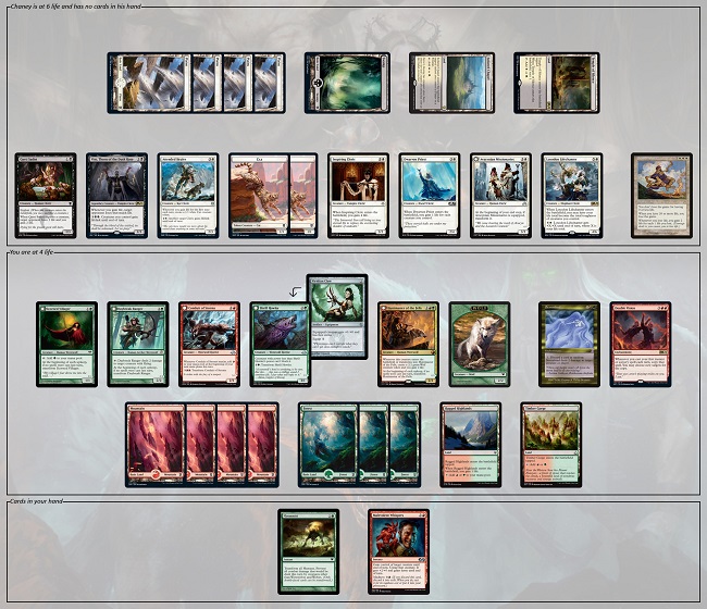Chaney is at 6 life and has no cards in his hand. He has the following cards in play: