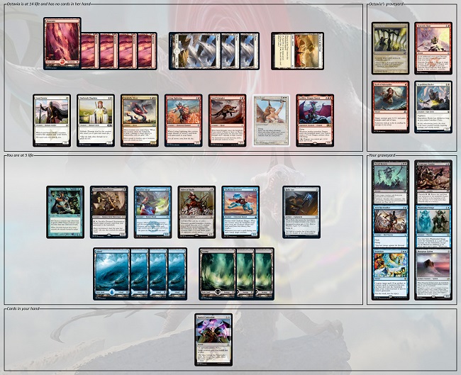 Octavia is at 14 life and has no cards in her hand. She has the following cards in play: