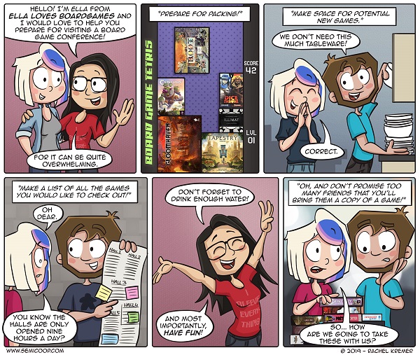 This comic has been brought to you by Semi Co-Op, a weekly webcomic about board games created by Rachel Kremer and Heinze Havinga. You can check out all of their comics on their website semicoop.com. This week's comic features the wonderful Ella from Ella Loves Board Games, who you can find on Youtube and Instagram!