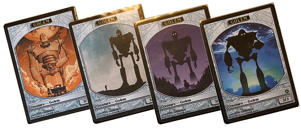 It all started with an old Karona, False God deck I built around a Golem theme. I was running a bunch of creatures called Splicers that create 3/3 Golem creature tokens. I even went online and found some pretty sweet fan art of the giant robot from the book and movie The Iron Giant and made custom Golem token cards to use with the deck. The tokens were super sweet, but the deck was hot trash. It might have won a game somewhere along the way, but it wasn't exactly high powered. It was from years ago so it probably wasn't particularly well built either. I didn't keep the deck together, but I kept those tokens.