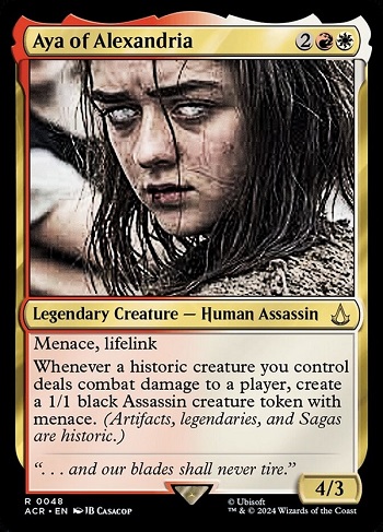 Aya of Alexandria is a Boros Human Assassin with menace and lifelink. She has a combat damage trigger that whenever a historic creature you control deals combat damage to a player, you'll create a 1/1 black Assassin creature token with menace. Aya isn't splashy, but with the right build she could help you make a decent little army of Assassins.