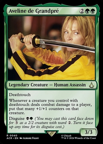 Aveline is a green Assassin, though her color identity is Golgari. She's got deathtouch and when a creature I control with deathtouch deals combat damage to a player, I'll put that many +1/+1 counters on that creature. Green gives easy access to trample, and if I want to get tricky I can play her face down for 3 mana as a 2/2 creature with ward 2. Much like with morph and manifest, I can turn her face up for her disguise cost.