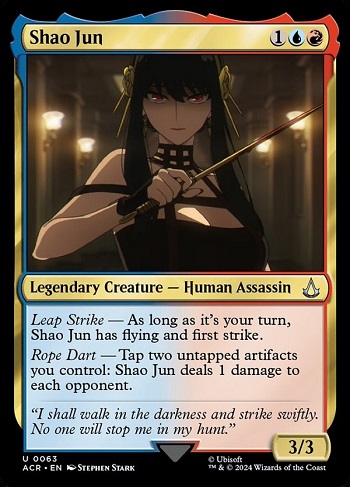 Shao Jun is an Izzet Human Assassin with Leap Strike. Leap Strike, unlike "flample" (flying and trample) is a real thing in Magic - as long as it's your turn, she'll have flying and first strike. She also has Rope Dart, which lets you tap two untapped artifacts you control to deal 1 damage to each opponent. While neither of those abilities are likely to be repeated in other Magic sets, they both feel very appropriate for the character I picked.