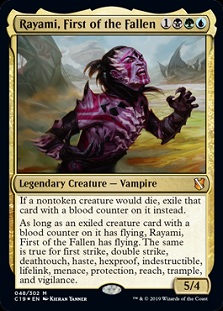 Commanders have to go to the graveyard in order to die, so they will probably never get exiled with a blood counter, but Rayami does seem like a great fit for a heavy control deck with lots of ways to kill creatures. If you can manage to sacrifice something with indestructible with Rayami on the field, he'll be ready for any boardwipe that might hit the battlefield.