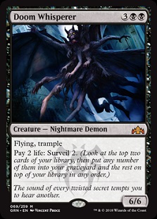 Lazav himself has surveil 1, which triggers when he enters the battlefield. As our commander, we may have to cast him more than once, so that qualifies as a repeatable source of surveil triggers, even if our goal is not to see our commander leave the battlefield. Doom Whisperer is an even nicer source of repeatable surveillance. This 6/6 Nightmare Demon costs ![]()