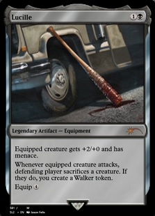 Lucille is Negan's favorite toy. This interpretation of it is particularly powerful, forcing the defending opponent to sacrifice a creature. It's fantastically good against anyone playing a low creature count voltron deck, and it's just generally a very strong card. A four equip cost makes it harder to easily swap around but any Negan deck worth its salt will have ways to tutor up Lucille and equip it for free.