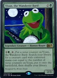 When you paint a character enough times, it gets a lot easier to get the character right. Kermit might not have the level of detail that a Muppet with fur or facial hair demands, but getting the shapes of his eyes, mouth, face and collar right were really important to end up with a good result. I decided to put him in front of a moonlit sea, though I could see an argument that he would have been better in a woodland setting. Having him playing the banjo made sense for Yisan, the Wanderer Bard.