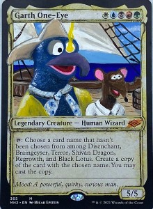 The decision for what to use for Garth One-Eye was an easy one after I cracked open a showcase variant of that card. The flavor text "Mood: A powerful, quirky, curious man" led me to go with one of the most quirky and curious of Muppets - Gonzo the Great.