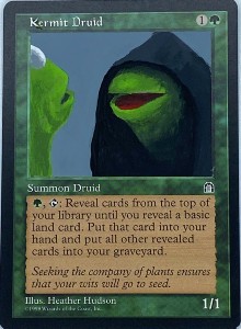 Muldrotha loves Spore Frog because he can bring it back again each turn by casting it out of the graveyard. This Kermit alter was from a screencap out of The Muppet Movie and was one of my first alters after I did my original Krosan Grovers.