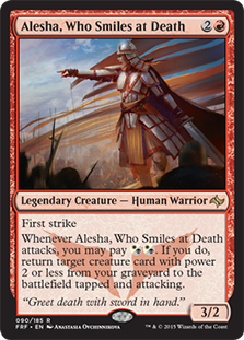 Alesha, who Smiles at Death is interesting in that she works on 2-power creatures, a la Reveillark and Imperial Recruiter, not on 2-mana creatures, although they mostly intersect anyway. It's hard to cheat value out of it aside from Clones (0 power) or cards like Siege-Gang Commander a la Boat Brew, but she works very well, as she has solid base stats as a ![]()