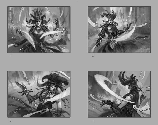 I started with few variants of how it could look like. I drew four black and white quick sketches, trying to show the scene from different angles. And at all of them girl is looking right at viewer eyes, grinning creepily, and her knives almost touching our face.