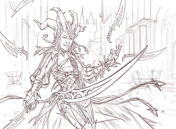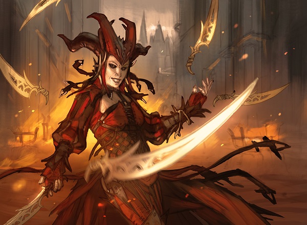 Dmitry: I was asked to draw Rakdos girl who is juggling swords somewhere in 10th District of Ravnica. I have to say that I really like the cult of Rakdos, all the insanity and menacing it has, this crazy circus out of hell is very appealing.
