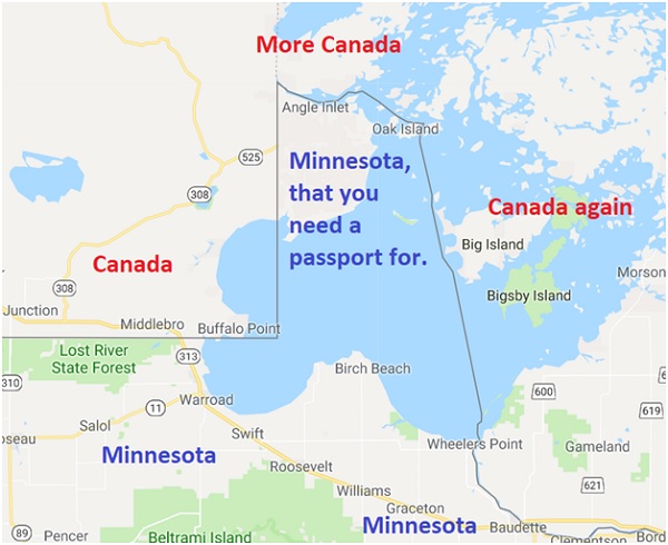 Surely, the old-fashioned creation of finding your way depends now wholly on context. A map of the full United States of America shows borders, perhaps topography or roads, where land masses align next to each other, and whatever this Northwest Angle thing is atop Minnesota.