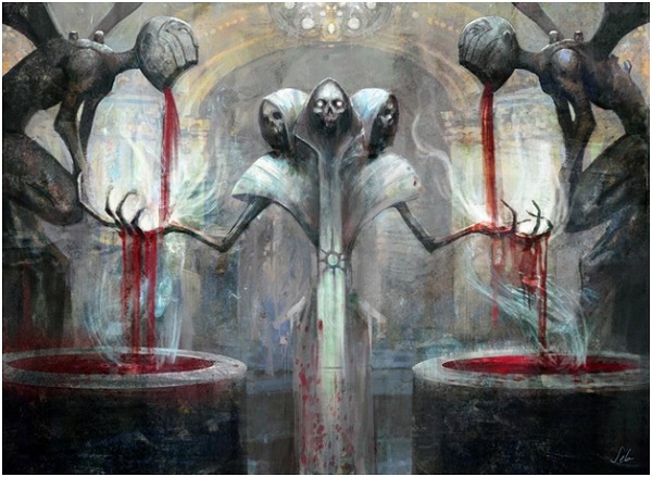 The image below, Debt to the Deathless by Seb McKinnon, isn't showing a debt. It's a conceptual piece that represents, Each opponent loses two times X life. You gain life equal to the life lost this way. There is no battle, no life being lost, and whatever X life represents. What we do understand that it's on Ravnica, it deals with the interplay between life, death and a church. All of that visual information isn't all immediately known from the image to all players, but we do see a vital role the Orzhov Ravnica guild plays in stretching life.