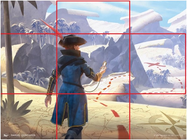 2. Rule of thirds -- If you were to cut this image into nine equal parts, then the figure is not quite centered, but rather slightly to the left. This pushes our eye to the right, creating a tension that intrigues us to see what the figure is looking at, the X. By showing us her back as she is looking outward, this isn't a creature being depicted, but rather the action that the figure is doing, thus, a spell in Magic: The Gathering.