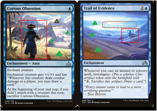 The green triangles show us the foreground, midground and background spaces in Trail of Evidence. Curious Obsession gives a fourth distance, the far distance. Having them pulls us into the image and allow us to see the journey that is before the figure and us, the player utilizing the card.