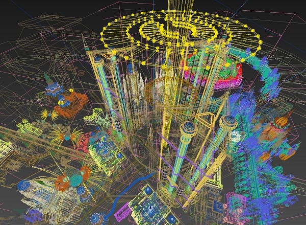 I did. I used 3DS Max to model it and V-Ray to render it out a mockup for lighting and perspective. But I ended up painting over all of it in order to give it a warmer, softer feel. Attached is a screenshot of a wireframe during its development. I have also included a couple sketches I sent to Wizards for review. The advantage of working in 3D is I can try many camera angles to try out composition options.
