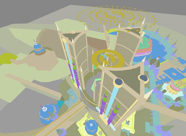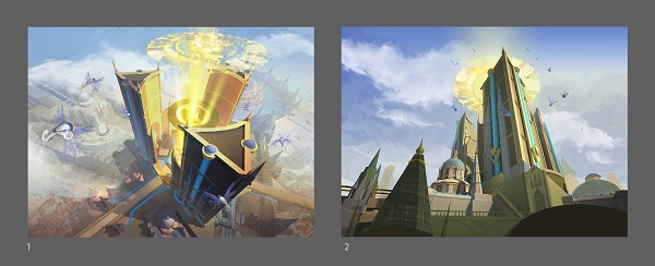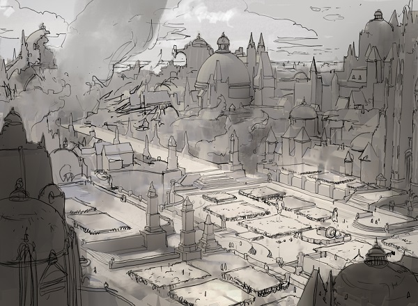 Kirsten: I pushed to do a bird's eye view of the towers, which I knew would be more challenging... but also more awesome. It meant significantly more render time since I would need to portray all the rooftops below. Also, the brief specified that the New Prahv towers needed to look imposing, which is harder to sell if you're looking down at them. The path of least resistance would have been to display a worm's eye view, which was the alternative sketch I submitted. However, it was less interesting visually so I'm glad it went how it did. I love rooftop views and the visual complexity they offer, and keep going that route when I get a chance as an artist...so I guess it's a "thing" at this point.
