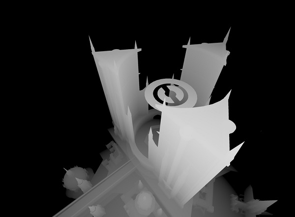I like the complexity of the cityscape with just a few holes punching through to the distant background showing just how far this environment reaches out. I think each layer of depth rewards the eye with different information and elements of the story, which is a nice subtle way to approach landscape-storytelling.