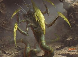 Six years later, and the art description issue has been fixed. They're both familiar with the single claw/spike, yet they have the tentacle headpieces introduced in the core set, reintroduced here. I think it's a nice touch fusing both into something slightly new.