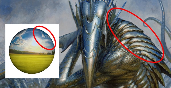 With a full seven commissions in Modern Horizons, Randy has reached the ability to work fast. Even so, he found some time to add just that extra touch of polish. Often what makes Magic art stand out is the reference. Things like clouds, skin, drapery folds and lighting are low hanging feedback points, but easy to say. Here, we see Randy added some lighting underneath the character's chin in orange, while making it believable and lit correct for a black man compared to a white man with darkened skin. He has natural hair and he sits in front of a lovely painted sky. Randy's doing some big things and finally getting noticed for it. I'm happy for him.