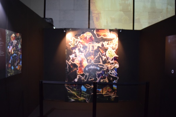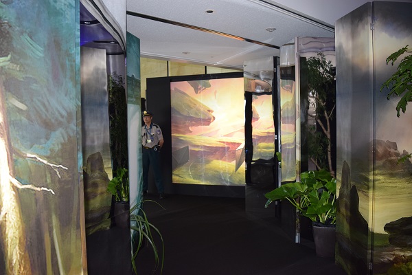 In a transitional area between the sets, video installation and moving into the art show area, a "planeswalk" was in order. The full art basic land you see was a reverse projection on a screen. It zoomed into the art and then changed to a different plane. While people want paintings in a traditional medium for an art show, this was a fantastic way for digital art to also have a home.