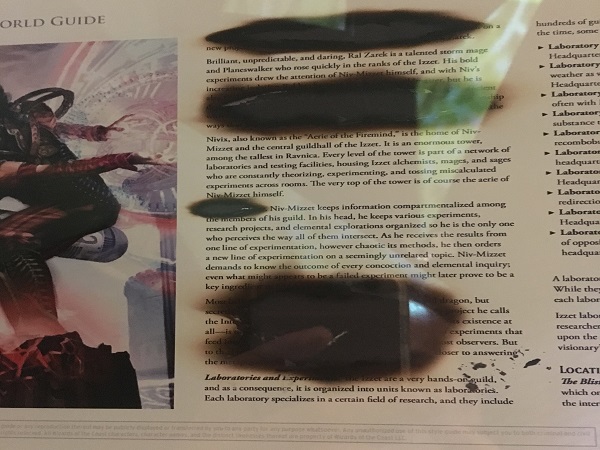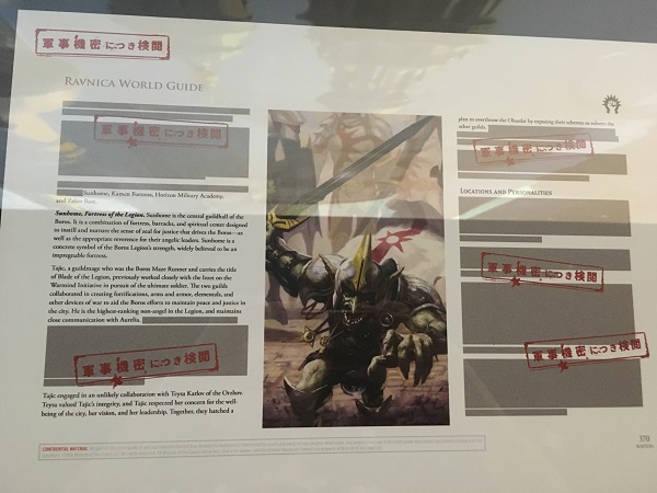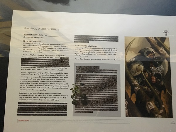 The final room of the exhibition was the Ravnica room. It had each guild represented on placards on the walls, along with each guild under glass from the world guide. The most interesting part of the world guides was that each guild would thematically "remove" parts that were secret or spoiler heavy according to their guild. Selesnya had dirt, Izzet had burned pieces out, and Boros had redacted pieces.