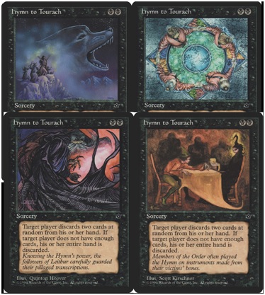 Delver deck at GP Paris], I used mismatched Hymns, because I happened to own two different ones. Nowadays, I just try to keep all my playsets with the same art. I usually try to stick to the one that comes to my mind first when I think of the card. For example, when I think of Ponder, it's the Lorwyn one, and when I think of Brainstorm, it's mostly the Mercadian Masques.