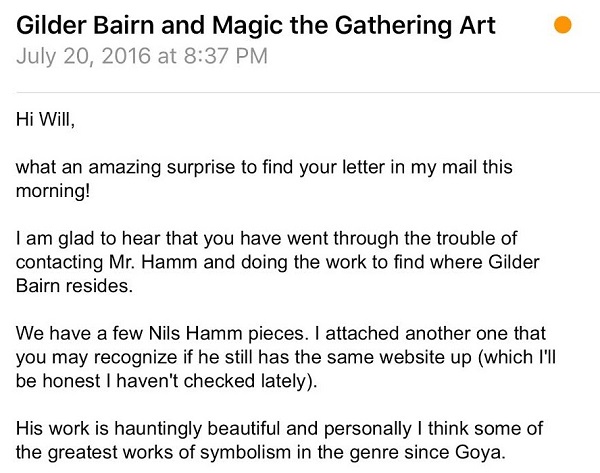 A month went by with no word. I had included my email address and phone number in my letter. I wasn't sure if I would get any communication but sure enough on July 21st, 2016 in the middle of San Diego Comic Con I received the email from the owner of Gilder Bairn. I was exhausted from walking all day at the con. I hadn't checked my phone for a few hours and I remember walking outside of Hall D to sit down and rest my legs... I was with some friends and my wife. When I checked my emails sure enough there was this email entitled "Gilder Bairn and Magic the Gathering Art." I was really excited and I'm pretty sure I squeaked out loud. The email was quite lengthy and K (as I'll refer to him) the owner had been a long time Magic player. At some point he had moved on though. He had kids and was married but had kept his Magic art despite selling off the majority of his card collection. I remember K saying this about Nils, "his work is hauntingly beautiful and personally I think some of the greatest works of symbolism in the genre since Goya." I was struck how passionate K was about Magic Art, and how similar our reactions were to Nils work and why we loved Gilder Bairn and the sort of haunting cuteness Nils had created.