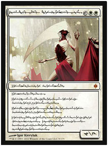 The year was 2011, and Mirrodin Besieged was being spoiled. The set’s spoiler video "All Will Be One" revealed to us the existence of a Phyrexian language. Created by a linguist hired by Wizards of the Coast, the language comes complete with rules of grammar and pronunciation, and it can be written top to bottom as showcased in the video. When New Phyrexia was announced, we were teased with the image of Elesh Norn, Grand Cenobite in all her compleated glory: