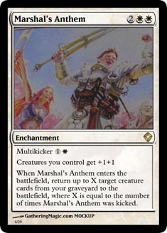 High Mana Efficiency OR EDH Bombs for Timmy - Multikicker was made for EDH. In a format where 12-15 mana isn't just common place, it's almost a rule; Multikicker reigns supreme. Even if the repeating effect is minimal, the fact that you can kick it numerous times can really turn a high mana yielding game on its head. Pair that with a bunch of classic bombs, Zendikons and man-lands; Worldwake offers more things to do with your all of that extra mana than we've seen before. Pat Chapin and others have recently written of an MTG "theory of everything". Essentially, the idea is that all Magic games are won and lost based on how effectively you spend your mana. It doesn't matter if you're drawing cards, doing damage, healing, playing creature spells or using affinity. Each of those things have a "cost" but also have a particular potency and you're just trying to do the most effective "stuff" with the smallest amount of mana possible. In other words - "play with 'good' or 'the best available' cards. Take a look at some of these Worldwake cards.. Terastodon allows an EDH player (or a couple of Timmys!) the chance to take care of three permanents, and put out a 9/9 beater for only 8 mana. This is the very definition of mana efficiency (if you've got the mana). Beastial Menace - 6 power for 5 mana divided up perfectly into three creatures.. could you be any more efficient with your mana? These cards not only please the Timmy in all of us, they're bombs that get the job done at a reasonable price. Many of them are only really fit for EDH due to their high costs, but if you can squeak them into your standard decks you'll reap the benefits of these card's high Mana Efficiency levels.