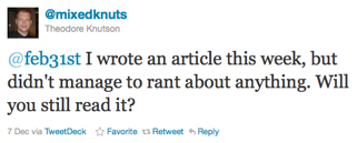 The upside, however, is that I get to wake up to a bevy of twitterings from the man who gave me my start in Magic writing: Ted Knutson, former SCG Content Manager. Ted’s been awake for a while by the time I get up because he lives in the United Kingdom, or Great Britain, or whatever, and since he is the most vocal of all the Twitter people I follow living in that time zone, I get to wake up to his twitterings every morning. My mornings usually go something like this: