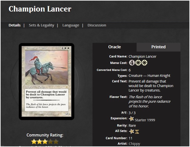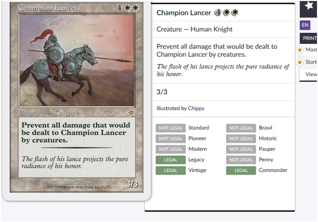 Champion Lancer is a great way to kick off the conversion. This was printed in the white-border Starter 1999 set. It was not a black bordered product. So why is this version in black border? No idea! You also note this for, say, Ninth Edition or the Battle Royale Boxed Set, Beatdownwhere the cards in Gatherer are in black bordered for some bizarre reason.