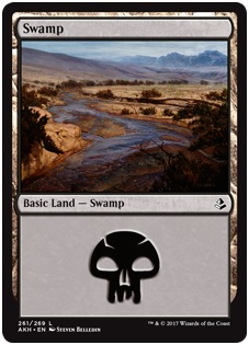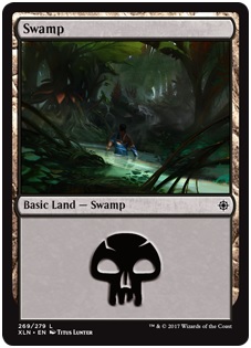 I enjoy art that stands out and tries to do something different. As a comparison, here are two other Ixalan Swamps. Note how rote they are.