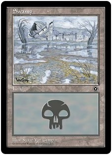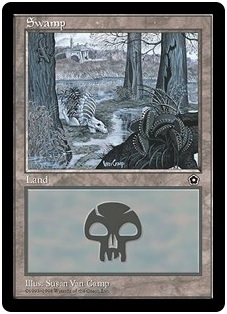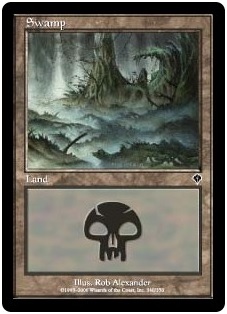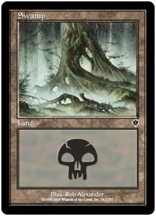 I am probably biased. I have a copy of this signed by Arnie Swekel after I beat him in a pre-release tournament at the time (he signed all of the art from my deck that he created). I may be biased, and I admit that up front. But I don't think so. I could be wrong! But I think this is a strong piece of art that stands on its own. For art during the era of traditional old-school works in the pre-modern art, this is an incredibly realistic piece. It has a strong style and sense of itself that I think is perfectly captures both the feel and look of a Magic Black Swamp as well as a place you could see anywhere.
