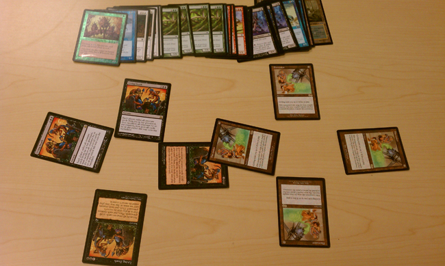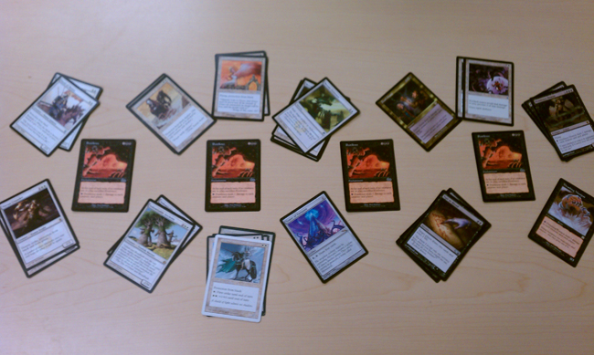 To deck or not to deck, that is the question. For any Magic player, a self-examination is necessary at some point early in his or her Magic life. How many decks is he or she going to have available? Some people only have one or three decks, and others seem to have boxes teeming with dozens. I used to be the first, with very few decks running around. Abe’s Deck of Happiness and Joy (a twenty-five-hundred-plus-card Highlander deck) had enough play variety that it met most of my needs for diverse decks. This project changes things massively, and after we are done, I’m going to have one hundred combo decks built. What will I do then? Will I just break them back apart? Will I keep them together and keep playing combo games against other decks among the one hundred? I have no clue!