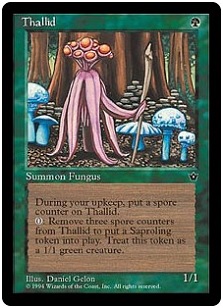 Ah yes, the Thallid! One of the strong iterations of the Fungus Among Us that made Saprolings. People played these a ton around the time of its release as the 1-drop that made the engine go. Later, when the mechanic was reintroduced in Time Spiral for that block, the initial Thallid was in the timeshifted sheet, and again, saw a new lease on life, especially with a Commander to lead the Saproling-making Fungus team -- Thelon of Havenwood. Of course, now you can run Slimefoot, the Stowaway if you prefer, in a post-Dominaria world.