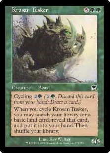 I'm so happy that the Tusker is Modern legal now! One of the renovations that this block brought to cycling was the cycling trigger. Cards like this or Renewed Faith are great because they can be cycled and still give you an effect, while also drawing a card. You can also cast the card if you need to. Sometimes, you just need life or a 6/5 beater, so you could drop these instead. But cycling triggers were awesome, and they were heavily used. Krosan Tusker was the best because it gave Green a powerful tool it rarely had before - card drawing. Because here is what Tusker actually does:
