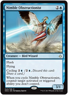 Would you play it? Of course you would! An uncounterable counter of abilities that draws a card and costs just three mana? That is an obviously powerful spell. You could counter ETB abilities of creatures that are about to throw down, like a key Nekrataal or the activation of that Oblivion Stone. My favorite is to counter the tap ability with a Sensei's Divining Top (which is often done in response to removal to tuck it) and kill it dead. Now, it’s not truly uncounterable, someone could use a card like Nimble Obstructionist to counter your Nimble Obstructionist, but you get the idea. And in addition to all of that, you get an on-curve 3/1 flyer with flash. It’s powerful, tricky, has a lot of dials on it, and can do a lot of stuff for your decks moving forward. Nimble Obstructionist indeed!