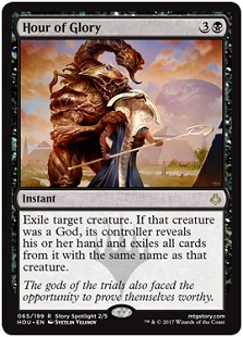 There was a time when Black never exiled target creatures. That was White’s side of the color pie. Black had an epic amount of ways to destroy target creature, but not to exile. That began to wane with cards like Gild, Sever the Bloodline, Oblivion Strike, Grip of Desolation, or Final Reward. It’s happening so often that I think we just have to admit that there has been a color pie shift on exiling target creature from Black. At this point we should just be looking for it. Hour of Glory does that. It’s better than most because it’s an instant and it’s just four mana, compared to many of the examples above. And you can see their hand if you hit a God, and finish any tricks with it. It’s good to be the exiling color too, so welcome Black.