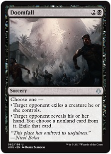 So yes, we are now expecting more exiling from Black, right? And you can see where Doomfall, ummm, falls into that category as well as an exiling version of Diabolic Edict and friends. There are going to be a lot of times when you are going to exile Edict someone hard and get that crap off the board. Often someone has just one big giant indestructible creature post-board wipe. Go away Blightsteel Colossus. Or they have one big creature that survived a damage-based one, like Multani, Maro-Sorcerer. Lots of people play safe, and don’t protect their big creatures from Edict effects, so that they aren’t hurt too much by mass removal. Punish them for their ignorance. And then if you don’t want to get your exile edict on, you can just Coercion someone instead, see their hand, and exile something from it that’s not a land. Often cards are most vulnerable when they are in the hand, like buyback spells (such as Capsize) or self-recursive tools (like the new Gods in this set or something like Genesis). You can exile something with aftermath or flashback to prevent it from being used twice. Either of these two modes is very very strong, and together, you have a package that always has value at the kitchen table.