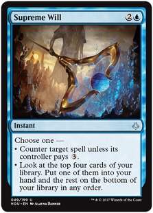 I like Mana Leak. I like Impulse. After they printed Impulse, WotC realized it was a little too good, and every variant of Impulse made since has been weaker, either costing more mana (Thieves' Fortune) or weaker by number (Anticipate, but only digs three cards). Supreme Will is the one-more-mana version of Impulse, but still gives you that flexibility, while also netting a potential Mana Leak instead. It’s never a dead card. You can always Impulse away for the best card among your top four and dig the rest of that crap down into the bottom of your library. It works with cards like Sensei's Divining Top and Scroll Rack quite nicely as well. And it can counter something! This is the sort of great tool that you can play in a lot of decks out there.