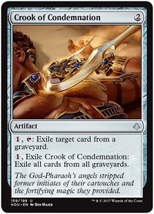 Frankly I think this might fly under the radar a little less because it’s a rare. There are two major tools in Hour of Devastation that hose all of the graveyards out there. The first is Crook of Condemnation. It’s a more expensive to play Relic of Progenitus that does not replace itself when you use it. On the other hand, note that the Scavenger Grounds does not enter play tapped or anything, so you can use the mana early, and then you have to sacrifice a Desert. Now if you want, you can sacrifice the Grounds and just move on. That’ll work. But like Dust Bowl, you can sacrifice something else and keep it around for more graveyard cleansing. There may be enough Deserts to care. This is precisely the sort of tool you can have and use as needed, and unlike something such as Bojuka Bog, it has not color identity to keep it out of non-Black Commander decks, and it doesn’t require the commitment of a non-land card, such as Tormod's Crypt or the Relic would do. There’s a lot to recommend in the Scavenger Grounds.